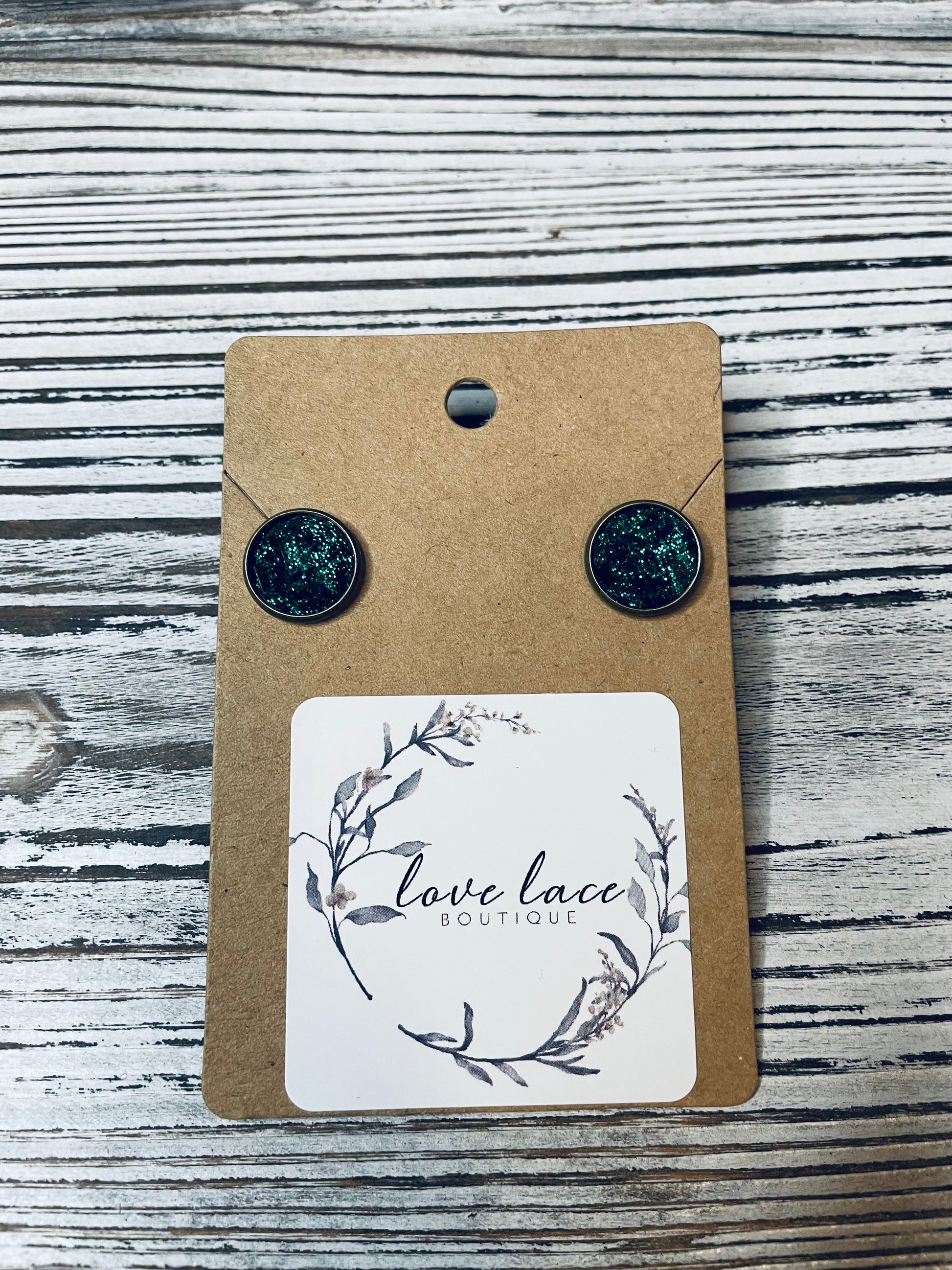 Green cheetah print stud earrings in brass setting. (Nickel and lead free)