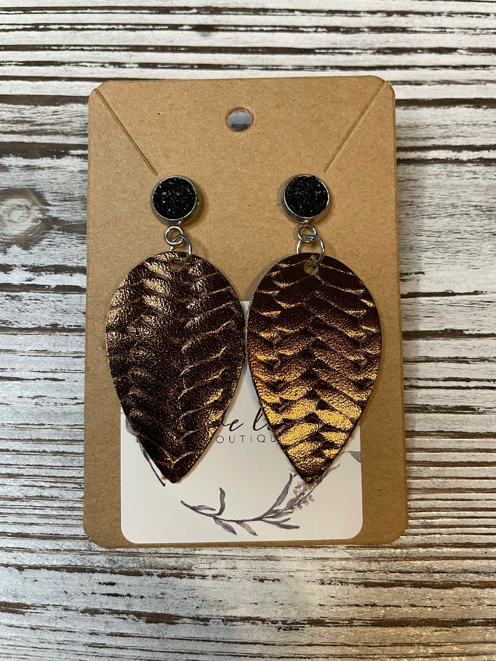 Bronze fishtail leather earrings with black gem stainless steel setting.