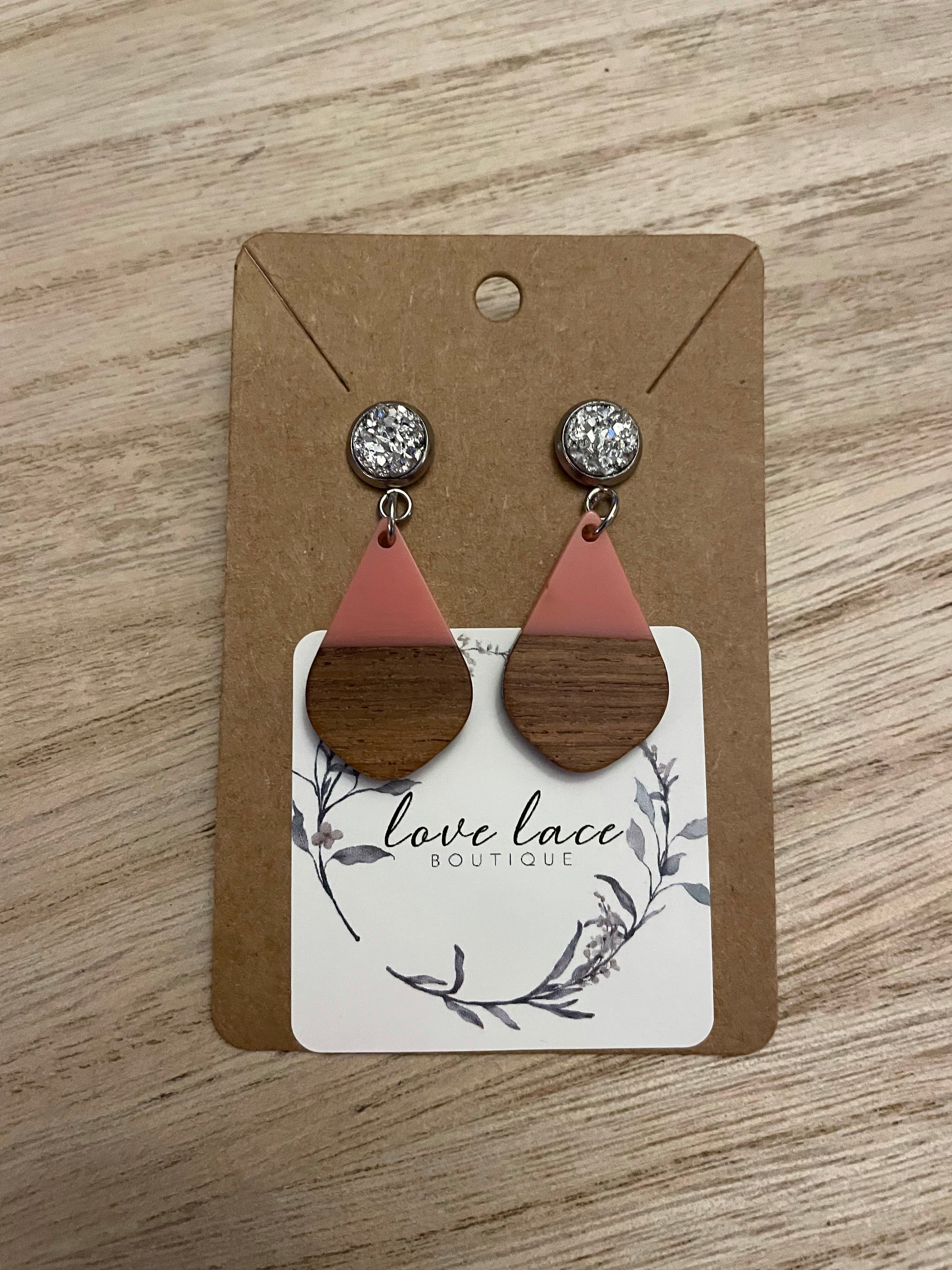 Pink and wooden earrings on a stainless steel stud with a silver gem.