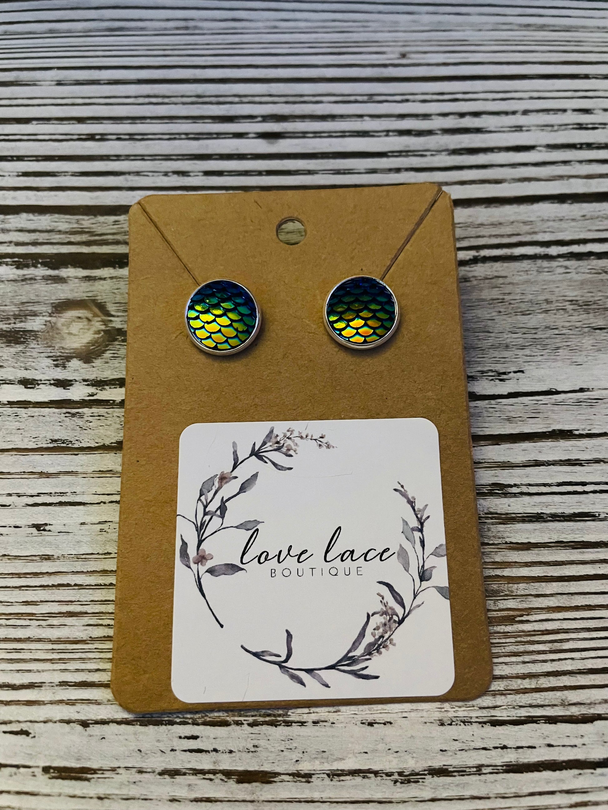 Green and Blue fish scale design in stainless steel setting.
